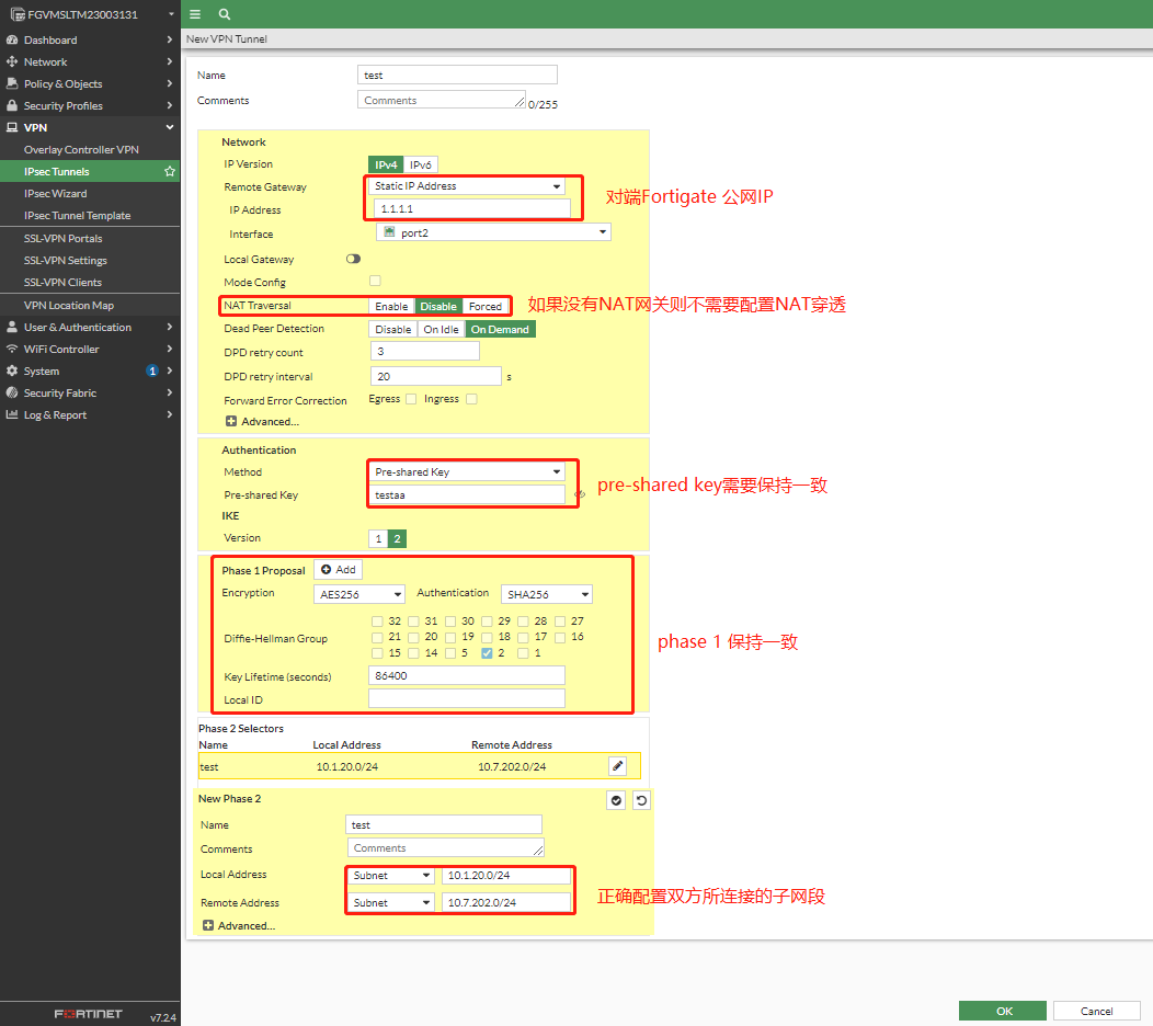 阶段1:在 IPSec 通信中,为了建立加密隧道的 SA ,需要在设备之间使用 IKE 协议完成密钥的交换。为了提高安全性,IKE 协议分为阶段 1 和阶段 2 两个部分。 IKE 阶段 1 是完成鉴别和保护 SA 通信的双方,同时生成阶段 2 需要的公有密钥,建立 IKE SA 等工作。 认证方式可以是证书或者预共享密钥,演示采用的共享密钥,商量好的加密算法为AES256,解密算法为SHA256,IKE ID选的IP/FQDN中的第2种:FQDN DH是Diffie-Hellman Group,数字越大表示Oakley密钥交换时使用的公钥强度越强