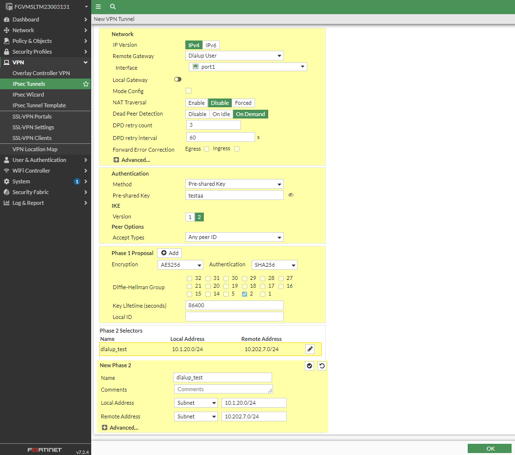 2个fortigate之间建立ipsec tunnel进行连接 - Dial-UP:即一端的